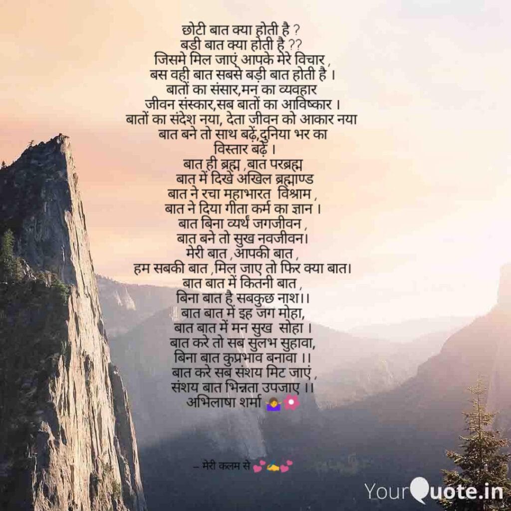 बात की महिमा अनंत अपार है । बात ही कारण और बात ही निराकरण है ऐसी परिभाषा है बात की । बात करने से ही सब संशय और भ्रम नष्ट हो जाते हैं। अधिकतर लोग अपने आप को छिपाने के लिए बात करने से पीछे रहते हैं। बात एक प्रकार की अभिव्यक्ति है। जो आपको बेबाक बना सकती है।