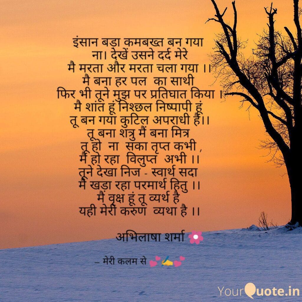 वृक्ष ही जीवन है अब यह सत्य बात लोगों के लिए मात्र निज स्वार्थ सिद्धि के लिए प्रयोग में लाई जा रही है। वृक्षों की व्यथा कौन सुने सब आडम्बर की अटारी पर चढ़ कर बैठे हुए हैं। विकास तो सबको सूझ रहा है परंतु आंतरिक दुःख से हर कोई अनभिज्ञ है ।